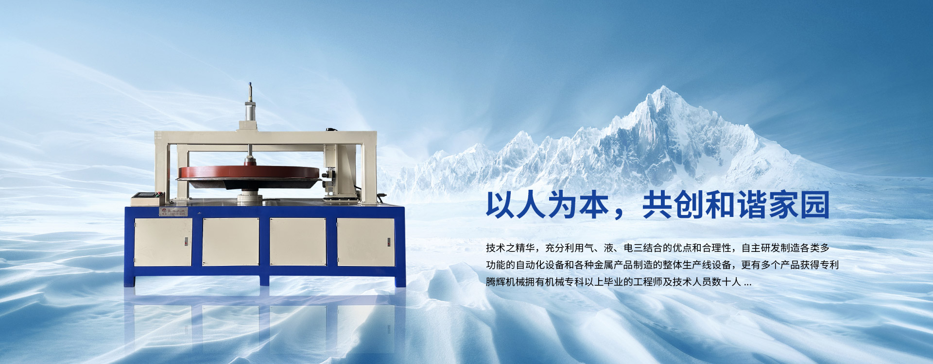 技術之精華,充分利用氣、液、電三結合的優點和合理性,自主研發制造各類多功能的自動化設備和各種金屬產品制造的整體生產線設備,更有多個產品獲得專利。騰輝機械擁有機械??埔陨袭厴I的工程師及技術人員數十人,各種職能部門配置齊全,擁有專業的設計,精湛的制造技術,具備一流的設備配套,還有完善的工藝流程...